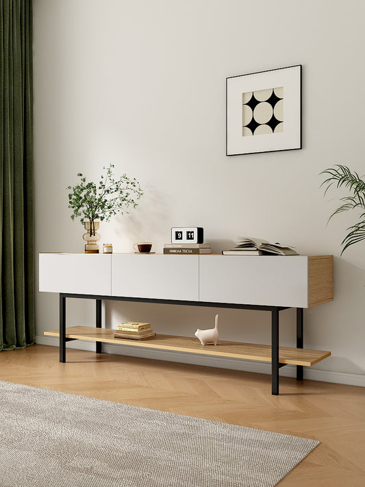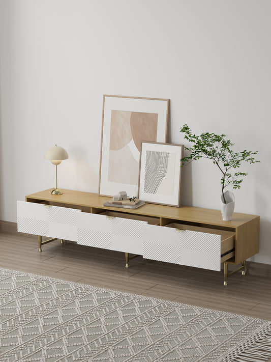 Natural Wood Color TV Stand with 3 Matte White Drawers