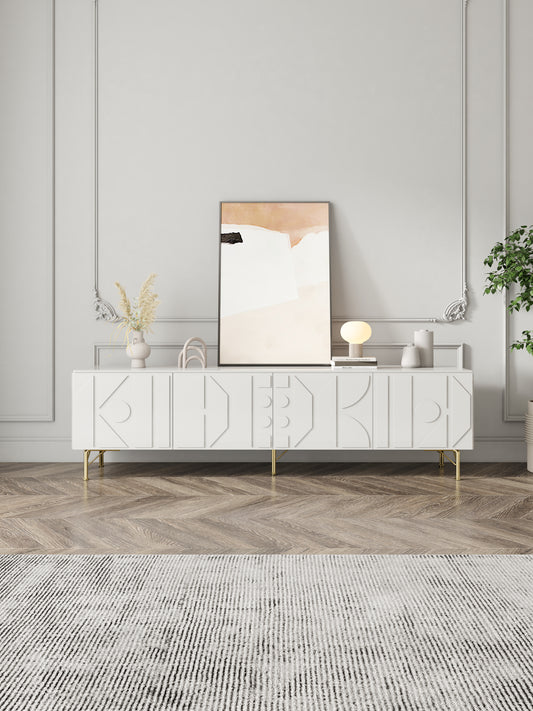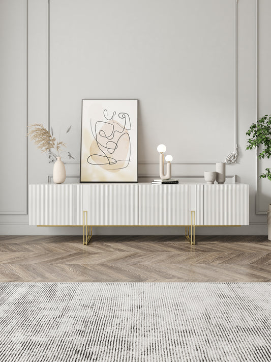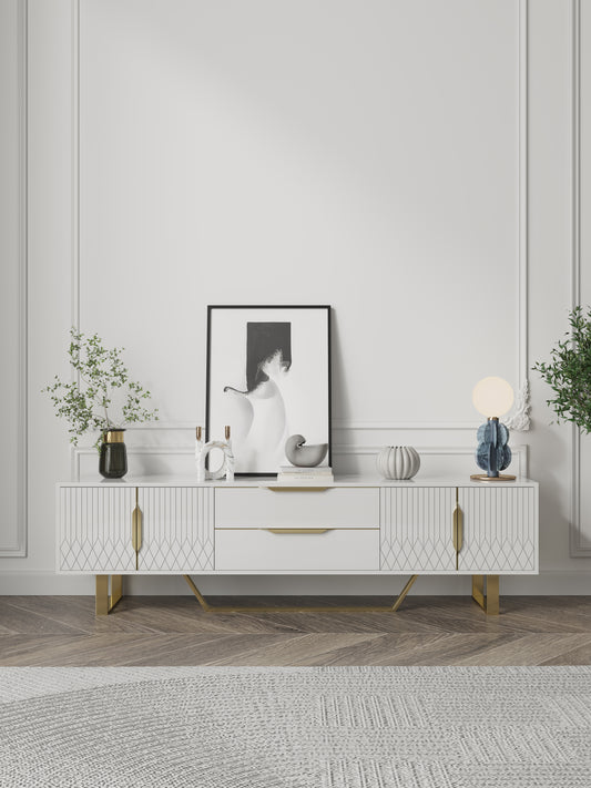 80" Modern Nordic Wooden TV Stand Fluted Design White & Gold with 3 Drawer for 80" TV
