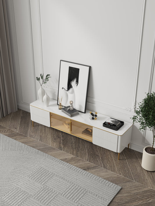 70.9" White Rectangle TV Stand Sintered Stone Top 4-Drawer Glass Doors Cabinet