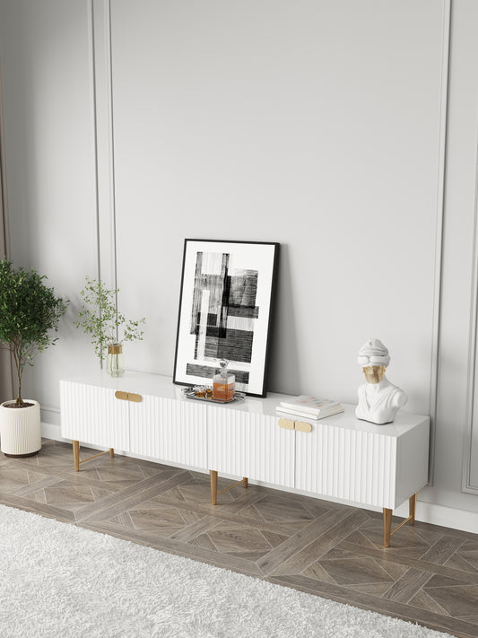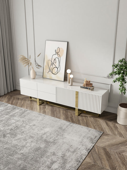 80" Modern Nordic Wooden TV Stand Fluted Design White & Gold with 3 Drawer for 80" TV