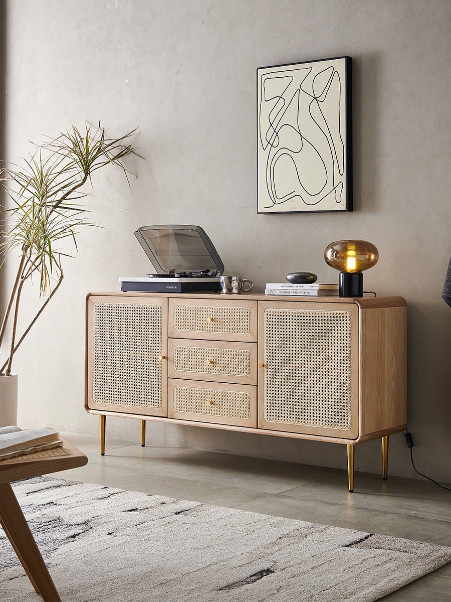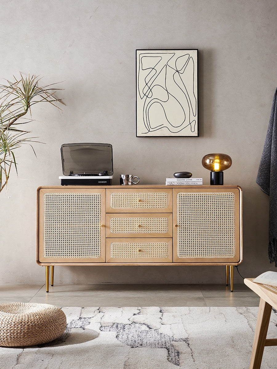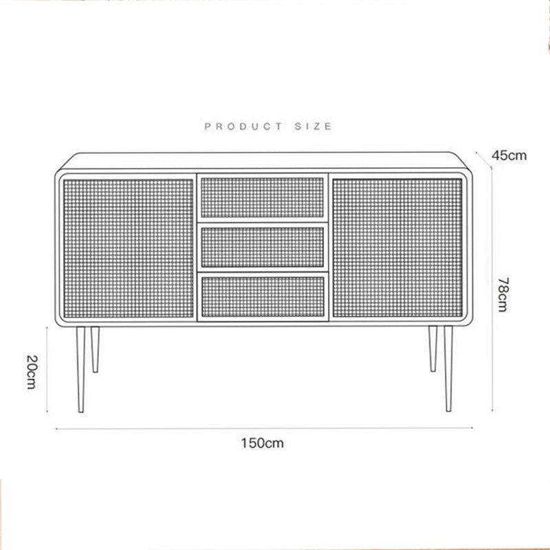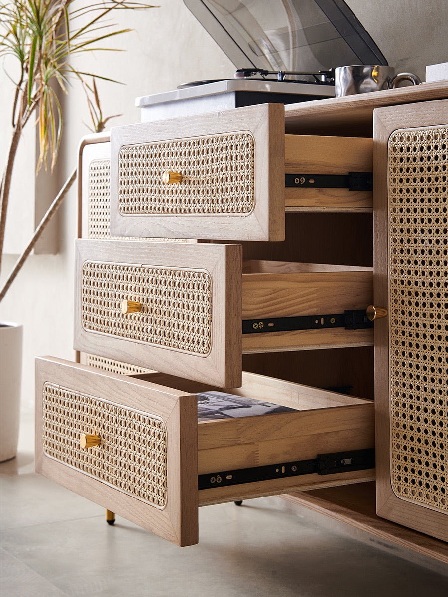 Beautifully designed with exquisite rattan craftsmanship and hidden pulls that are easy to open and close, this piece creates a refreshing sense of order in your home. Featuring 2 doors to reveal 4 shelves and 3 drawers, it enjoys ample space to store dining linens, plates, and other kitchenware collections, stunning and functional. Boasting refined ash wood and plywood, this sideboard buffet allows long-lasting service and timeless sophistication.